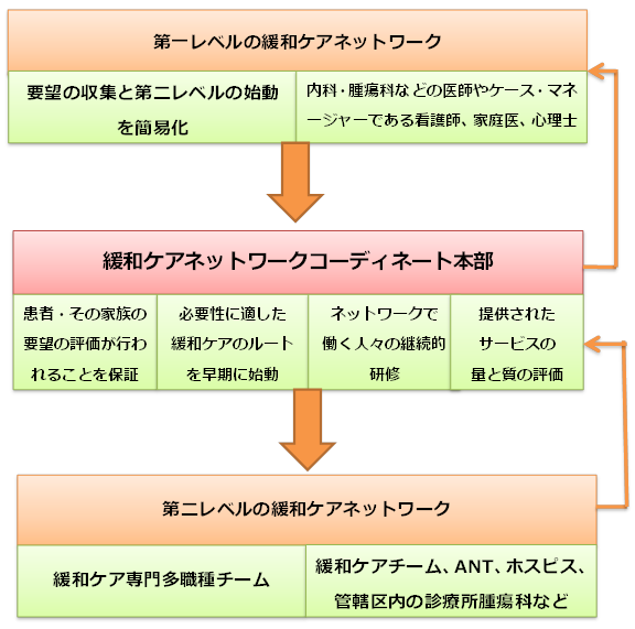 ⇒緩和ケアコーディネート本部は、患者やその家族のニーズを評価し保証する。ニーズに応じた緩和ケアのルートを早期に始動。 - 第2レベルのネットワーク(専門家チームによる支援)