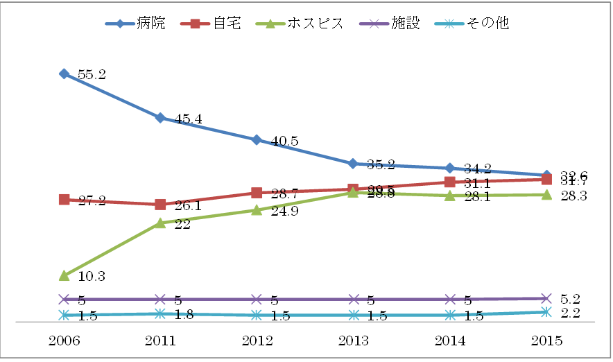 2013年の緩和ケアネットワーク開始時の申請者数は520名であったが、徐々に広がり2018年には1,331人と2.5倍に増加した。がん患者の死亡場所については、2006年は病院55.2%、自宅27.2%、ホスピス10.3%、施設5%であった。2015年には、病院は32.6%に減少し、自宅は31.7%と微増、ホスピスは28.3%に増加した(図2)。
