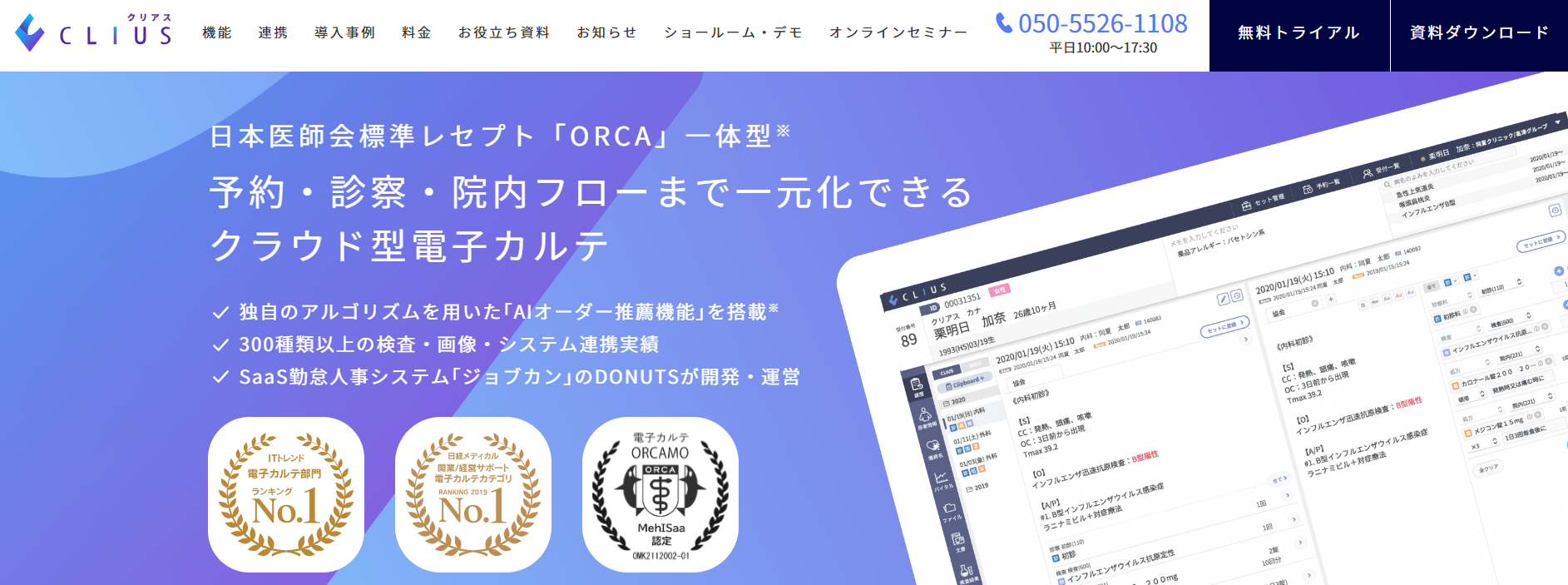 SaaS勤怠人事システム「ジョブカン」の株式会社DONUTSが開発・運営するクラウド型電子カルテ。