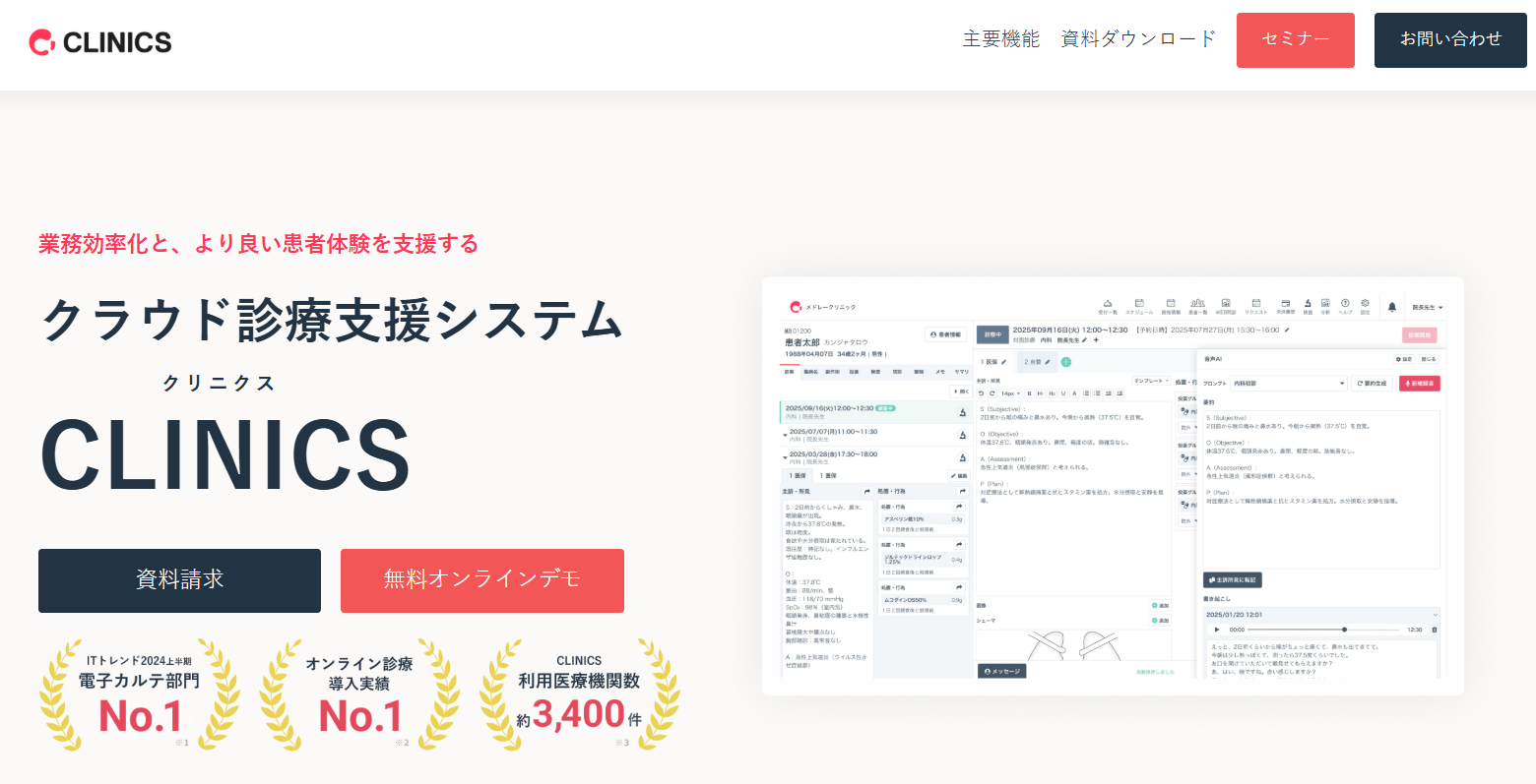 オンライン診療に強みがあり、「CLINICSオンライン診療」と連携することで、カルテ上から患者アプリと直接つながります。