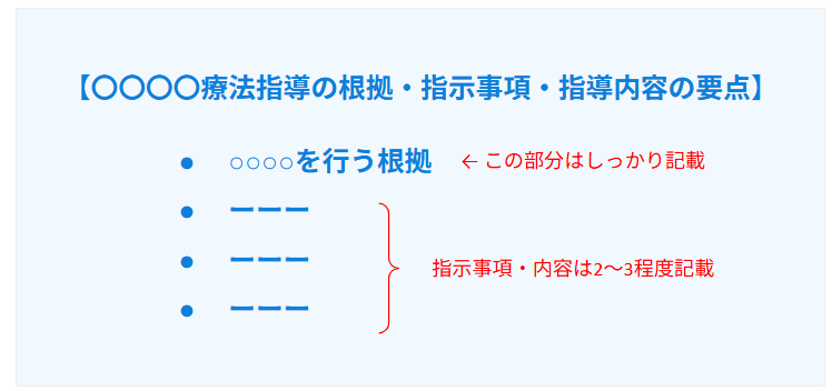 | 【第2節第1款在宅療養指導管理料 通知11】 当該在宅療養を指示した根拠、指示事項(方法、注意点、緊急時の措置を含む。)、指導内容の要点を診療録に記載すること。 |