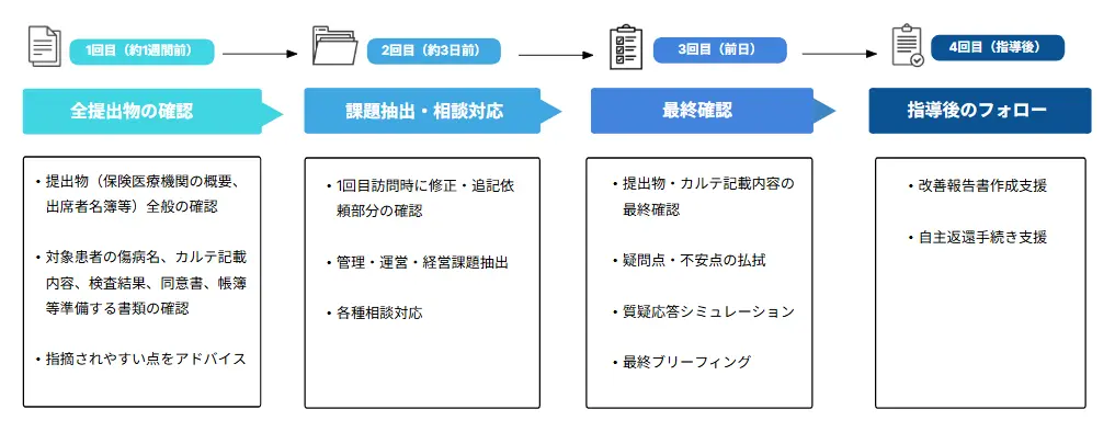 - 約1週間前:【書類チェック】提出物・カルテの確認、指摘されやすい点をアドバイス。